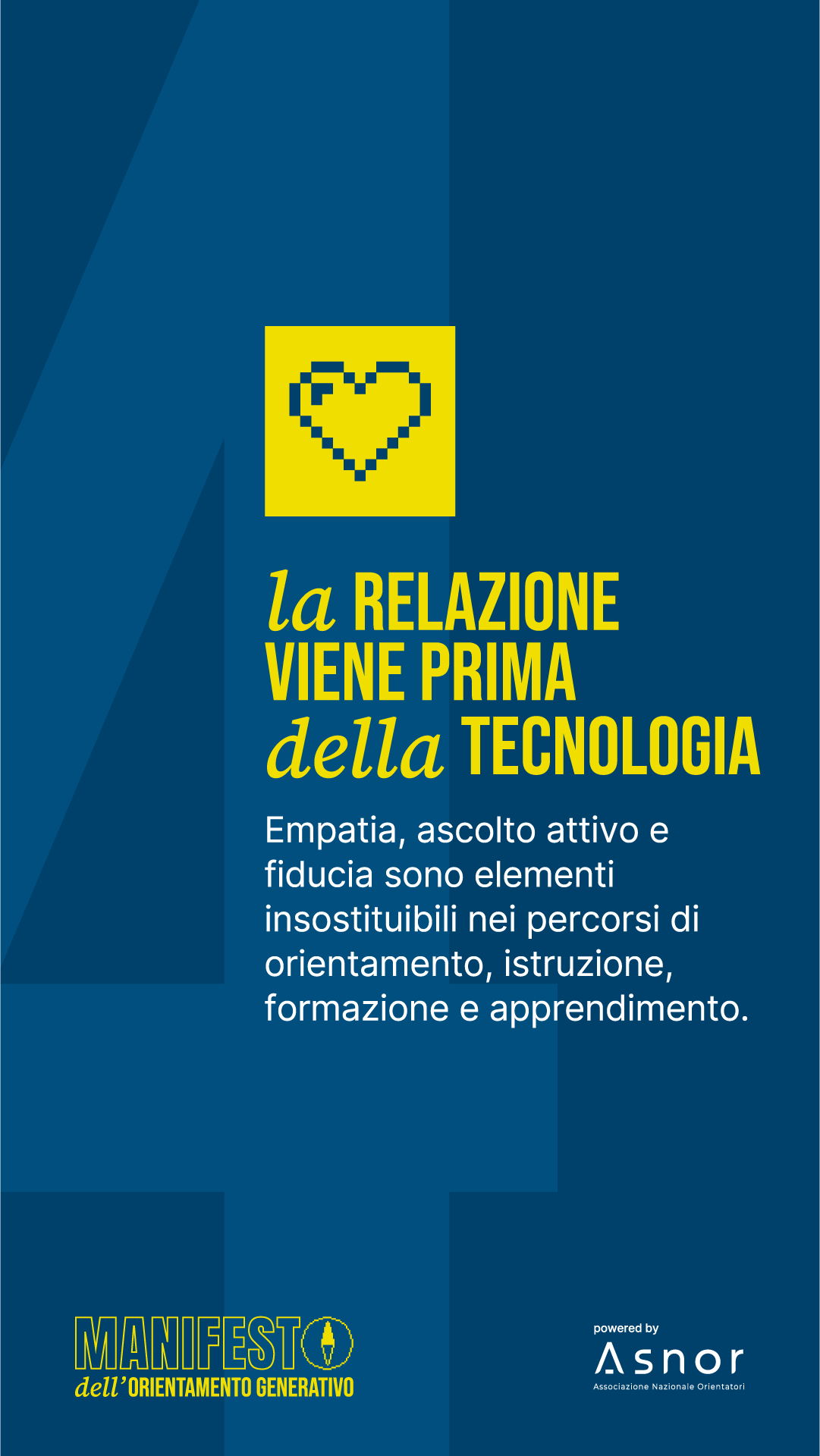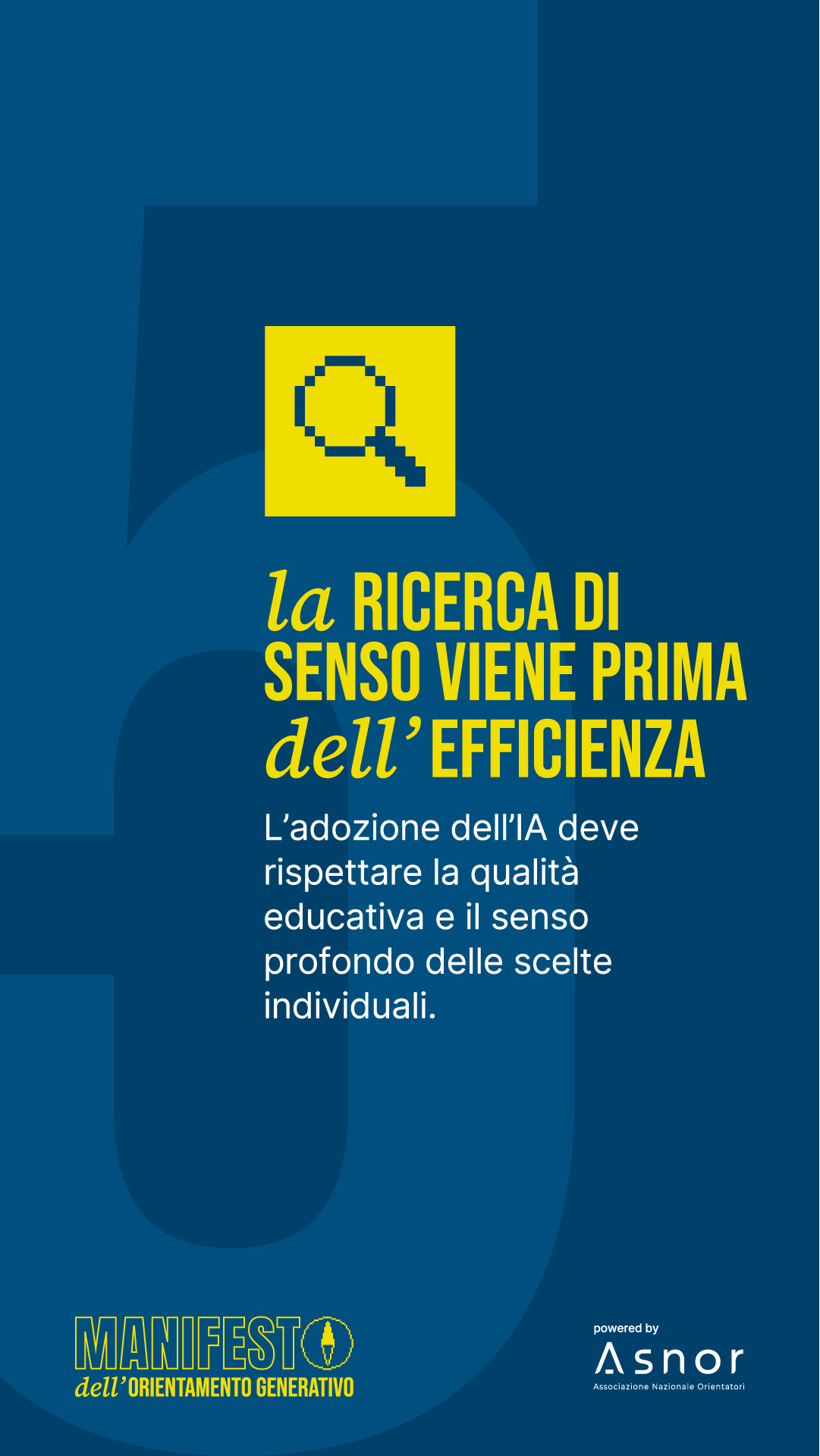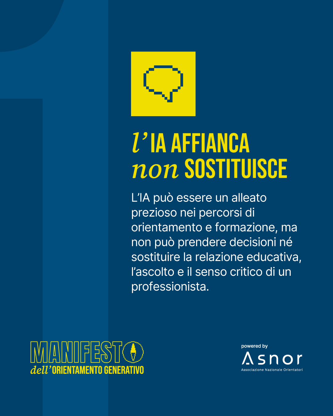 Frutto del lavoro del Focus Group Asnor su IA e Orientamento, condotto dagli Orientatori Benedetta Boscoletto, Silvana Macri, Dario Madeddu, Mariella Navone, Davide Patruno, Fausto Sana, Maria Grazia Sasso e Manuela Stefanelli, il Manifesto afferma che, anche nell’era dell’intelligenza artificiale, l’orientamento resta un atto profondamente umano: capace di generare fiducia, consapevolezza e nuove opportunità.
